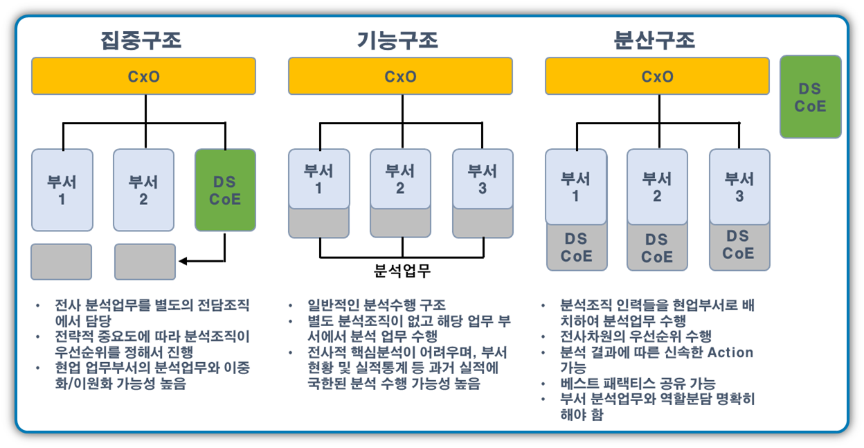 - 조직 내에 별도의 독립적인 분석 전담조직을 구성하고, 회사의 모든 분석업무를 전담조직에서 담당한다.